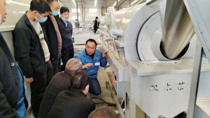 “這個是我們今年經改進后新推出的殺青做形一體機,采用分組控制,功能更加智能化,這款60型殺青機每小時可殺200余斤鮮葉。”雙木農機現場工作人員針對展銷產品性能及特點為參會嘉賓作了詳細介紹。